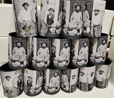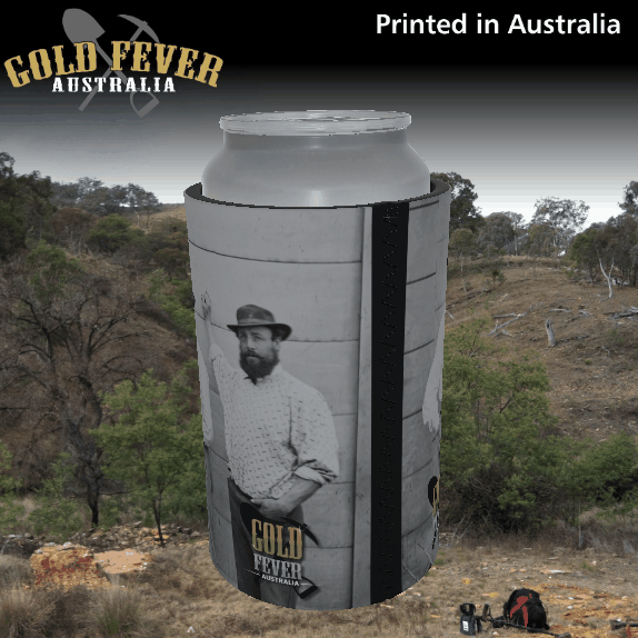 This stubby cooler has a base and features a photo of some the Hill End NSW old timers and their finds along with two small GOLD FEVER AUSTRALIA logos. These stubby coolers ensure that your favourite cold one stays that way.